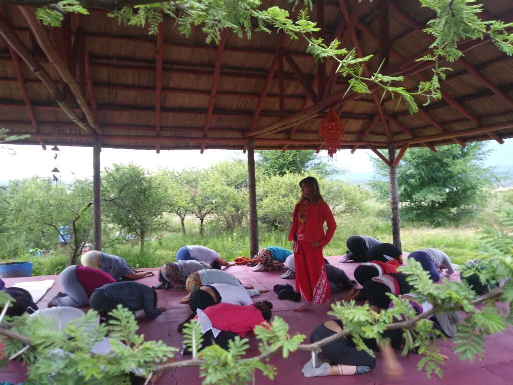 Practicamos diariamente meditación en silencio, respiración, posturas, pranayama, relajación, canto de mantra y kirtan, alimentación natural ayurvédica y seva Yoga.